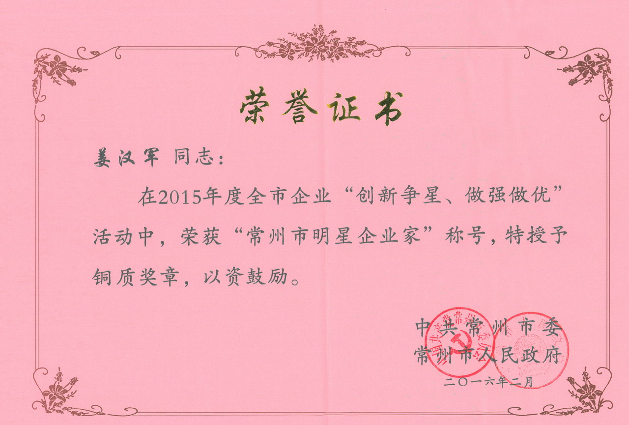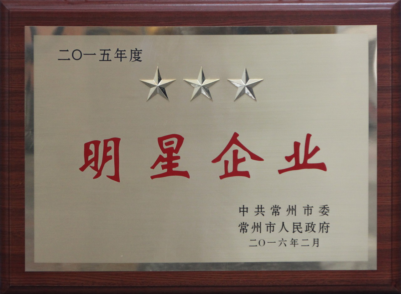 公司榮獲常州市“工業三星企業”的榮譽稱號,公司董事長兼總經理姜漢軍被常州市委、市政府授予“常州市明星企業家”的榮譽稱號。